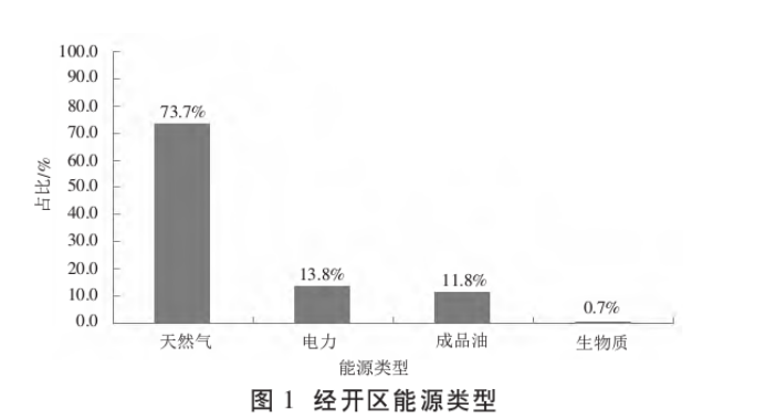 經(jīng)開區(qū)主要能源類型為天然氣(占73.7%)、電力 (占13.8%)、成品油(占11.8%)和少量的生物質(zhì)能(占 0.7%)。主要用能領(lǐng)域包括工業(yè)生產(chǎn)用能,交通運(yùn)輸用能,居民、商業(yè)生活用能及冬季供熱用能。工業(yè)用地以白酒釀造、包裝彩印為主要產(chǎn)業(yè),用能以天然氣、電力為主;公服、商業(yè)用地以及居住用地用能以電力、天然氣為主。經(jīng)開區(qū)能源類型如圖1所示。